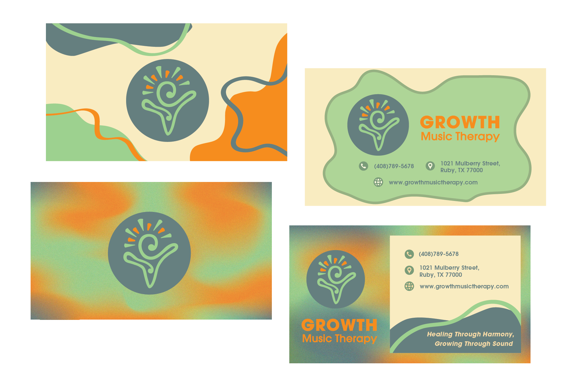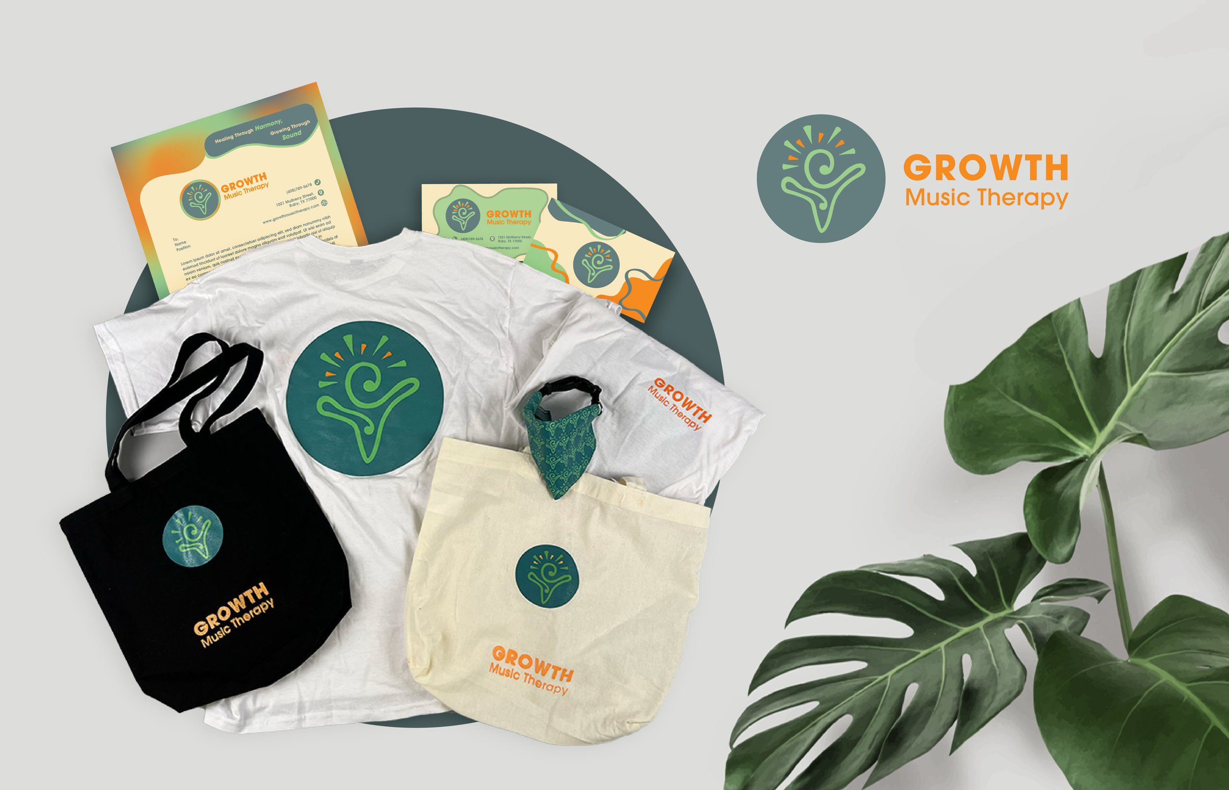 From there, I sketched logo ideas, refined them digitally using geometric forms and grids, applied color and typography, and learned technical standards such as RGB versus CMYK and created a final brand sheet that outlined all elements of the visual identity. Lastly, I applied the Growth Music Therapy brand identity to a business card, letterhead, and app icon, and screen-printed the design onto physical materials to demonstrate how the visual system translates across different brand applications.