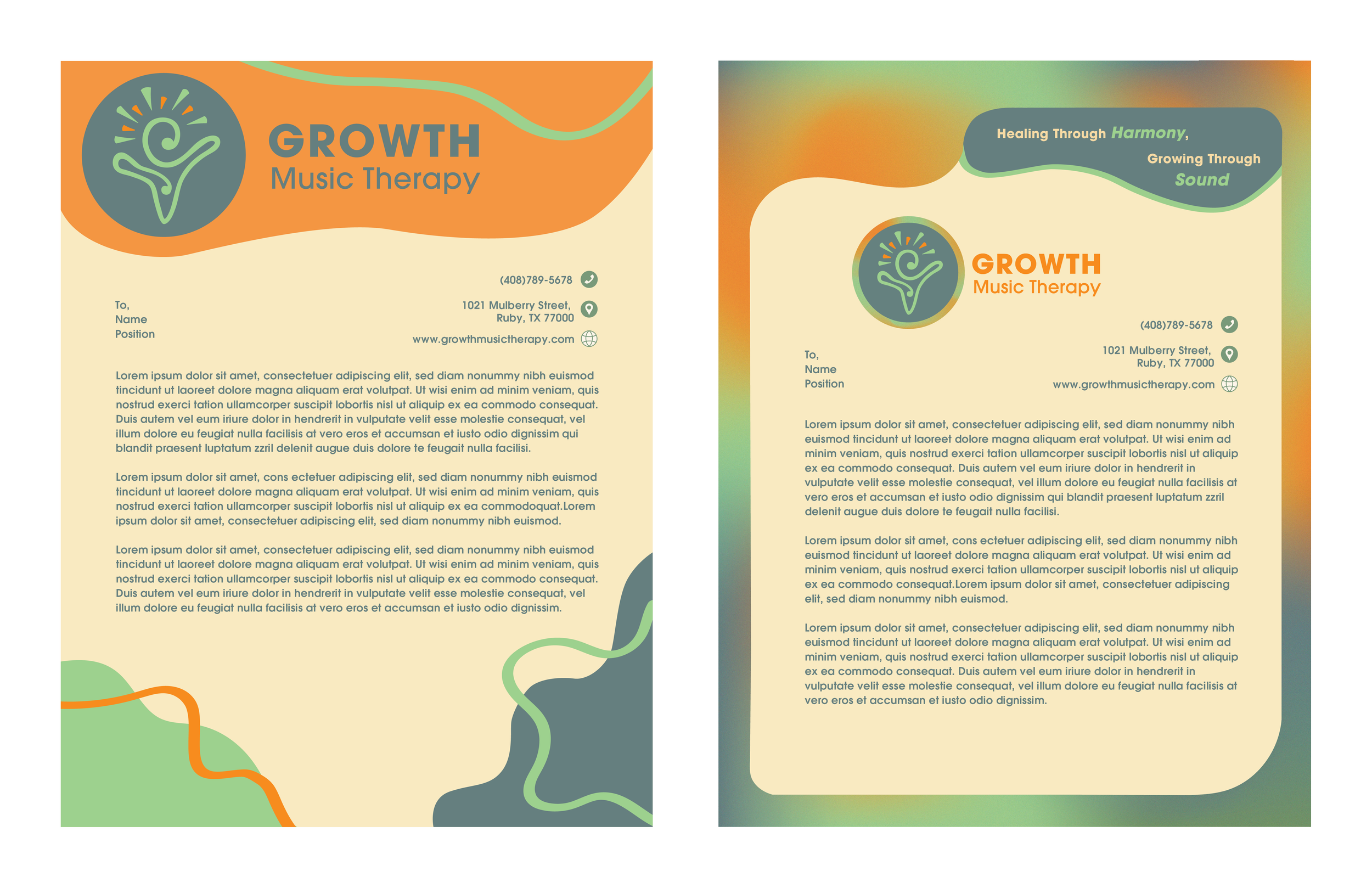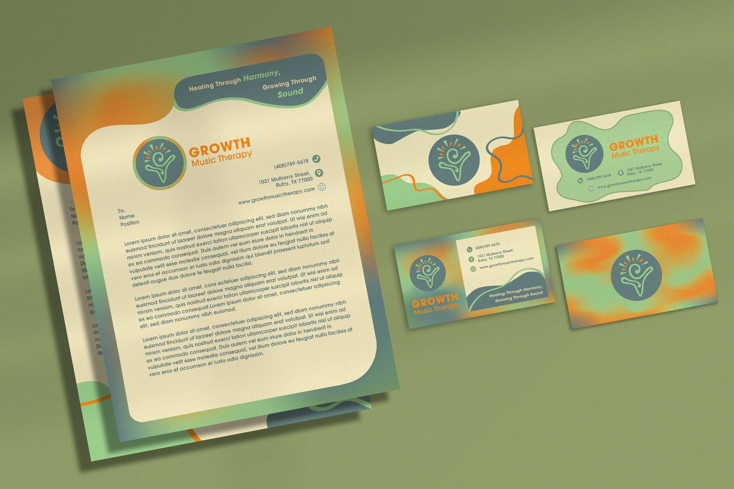 Business card & Letter Head: included a custom gradient using the brand colors. Created a graphic element using inspiration from the organic flow of the logo.
